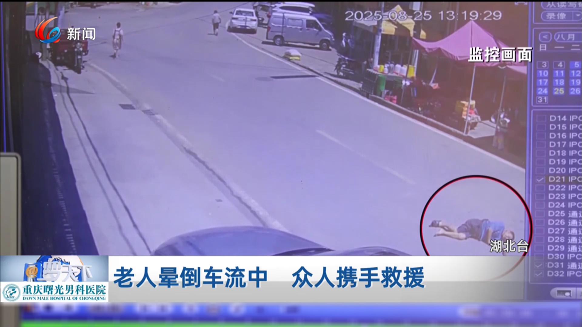 老人晕倒车流中 众人携手救援