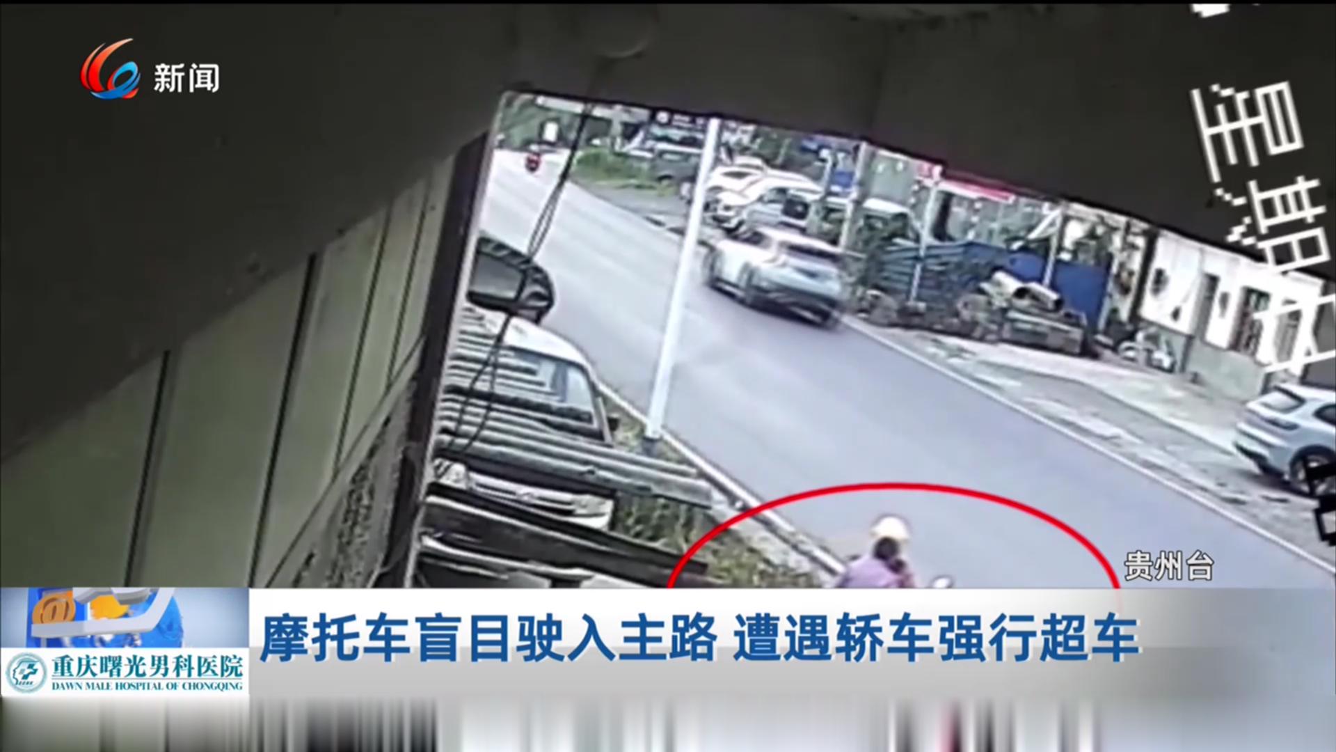 摩托车盲目驶入主路 遭遇轿车强行超车