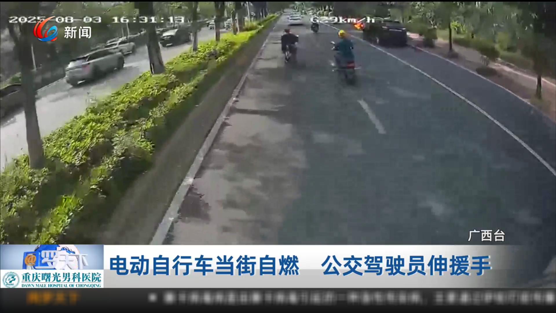 8月3日下午,在南宁,一辆行驶中的电动自行车突然起火,路过的公交驾驶员立即停车施救,所幸事件没有造成人员伤亡。