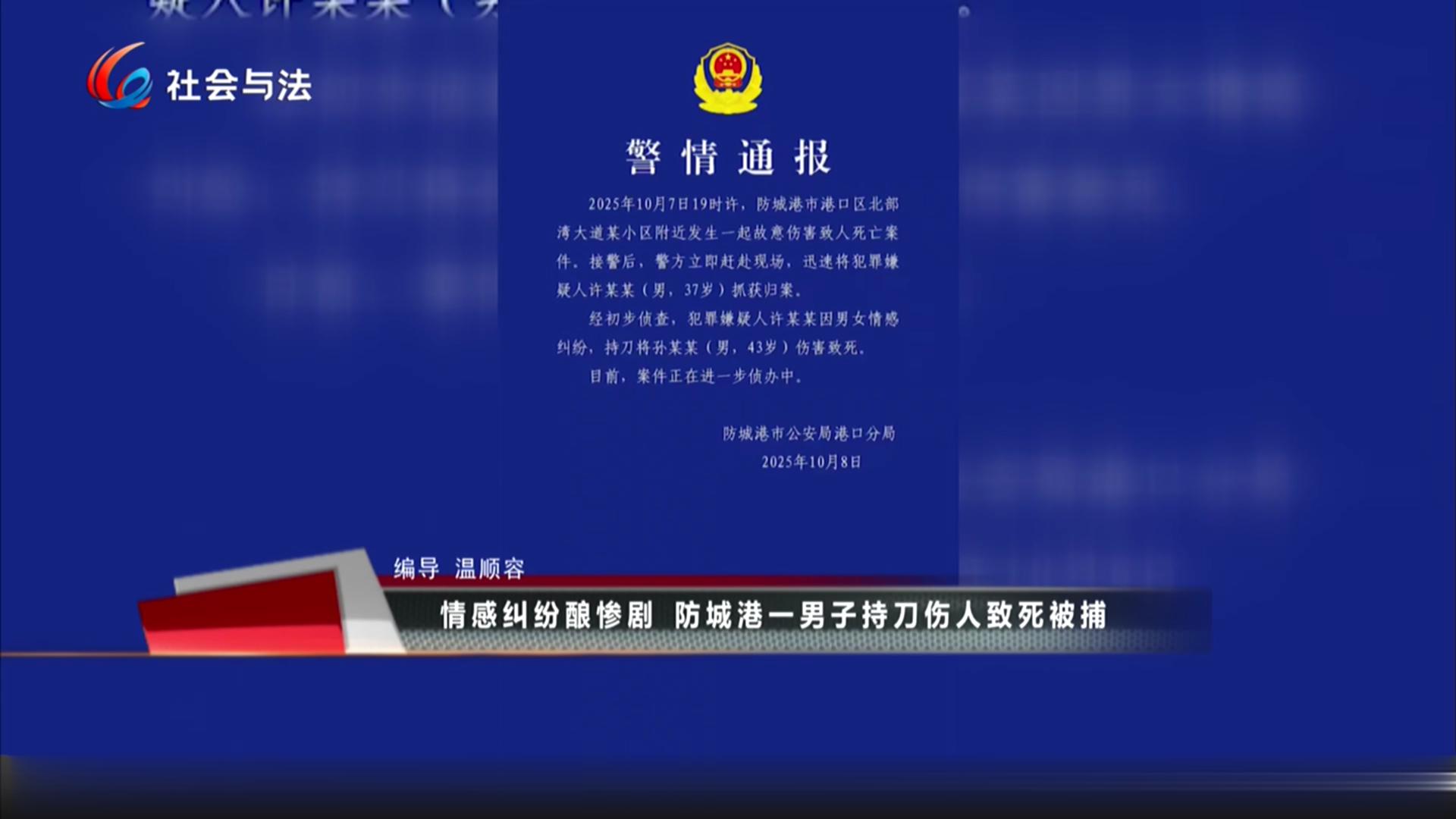 情感纠纷酿惨剧 防城港一男子持刀伤人致死被捕