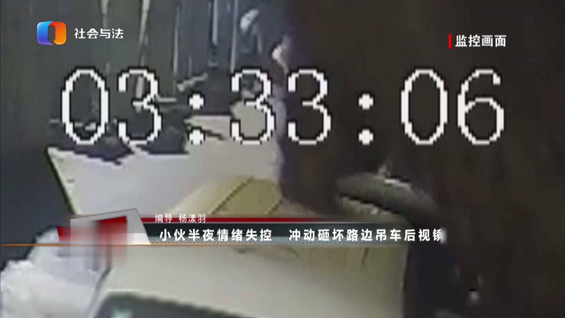 小伙半夜情绪失控 冲动砸坏路边吊车后视镜