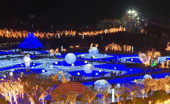 春节期间,夜色璀璨,一场迎春奇幻灯光展在垫江牡丹樱花世界上演,各类彩灯将夜空映衬得流光溢彩,宇宙星空、金色麦田、绚丽花束……百万盏彩灯组成了意象万千的光影,让这个春节年味儿十足。
