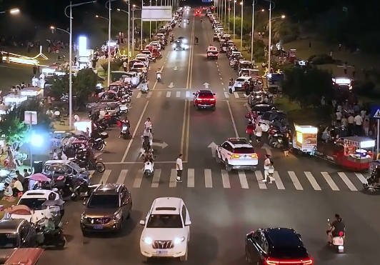 夜幕降临,在铜梁龙腾大道延伸段,烧烤、咖啡、手工冰粉……各类美食摊在公路旁有序排开,现场一派热闹的夏日夜景。市民游客三五成群围坐在草坪边,吃着烤串吹晚风,纵享独属于夜晚的人间烟火气。