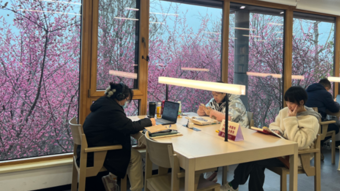 近日,重庆鸿恩寺森林公园内梅花迎春绽放,从江北区图书馆新馆的2楼望向窗外,一树树红梅跃然眼前,花香与书香相伴,别有一番韵味。