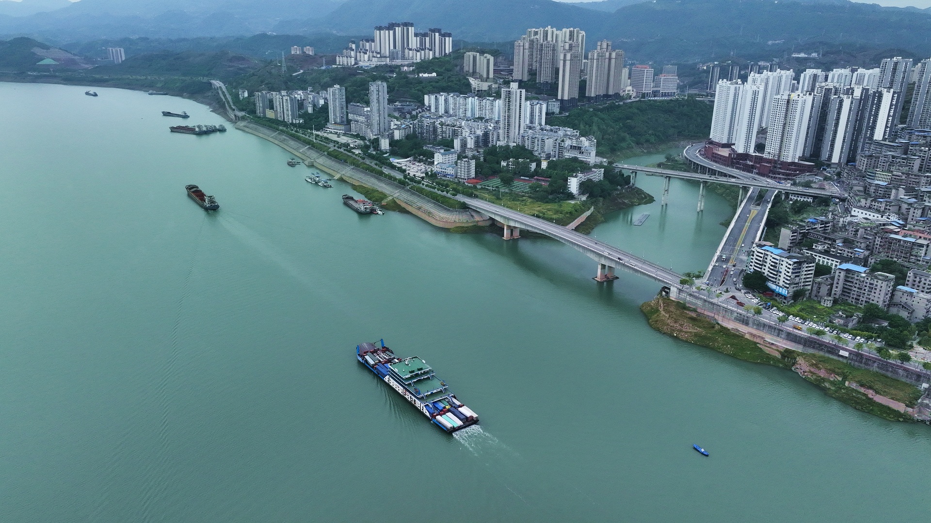 近日,长江忠县段水位达到160米以上,江城忠州再次展露出高峡出平湖的壮美景观。