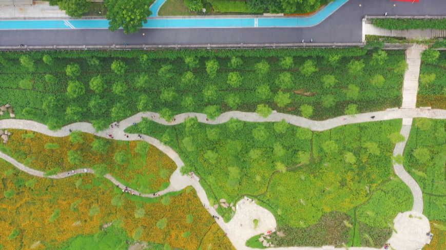 5月30日,万州白鹭湾湿地公园连片的鲜花竞相绽放,从空中俯瞰壮观美艳,吸引了众多市民和游客前往打卡观赏。