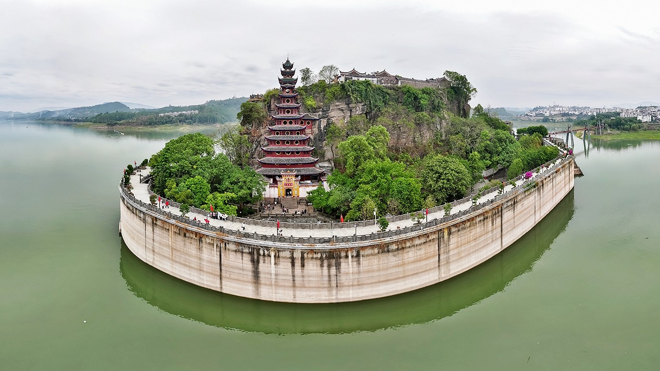 10月4日,长江忠县段水位达到163.1米,石宝寨再现“江中盆景”独特景观,吸引3000多名县内外游客前往观赏美景。