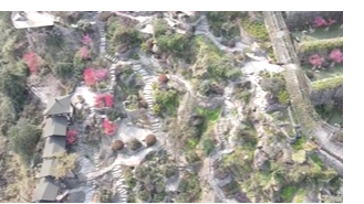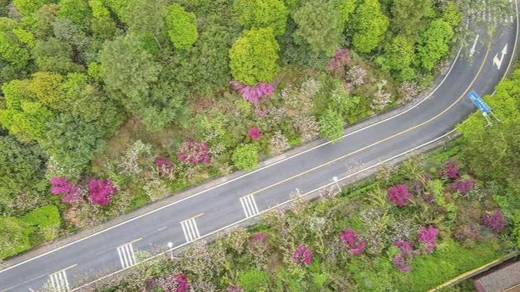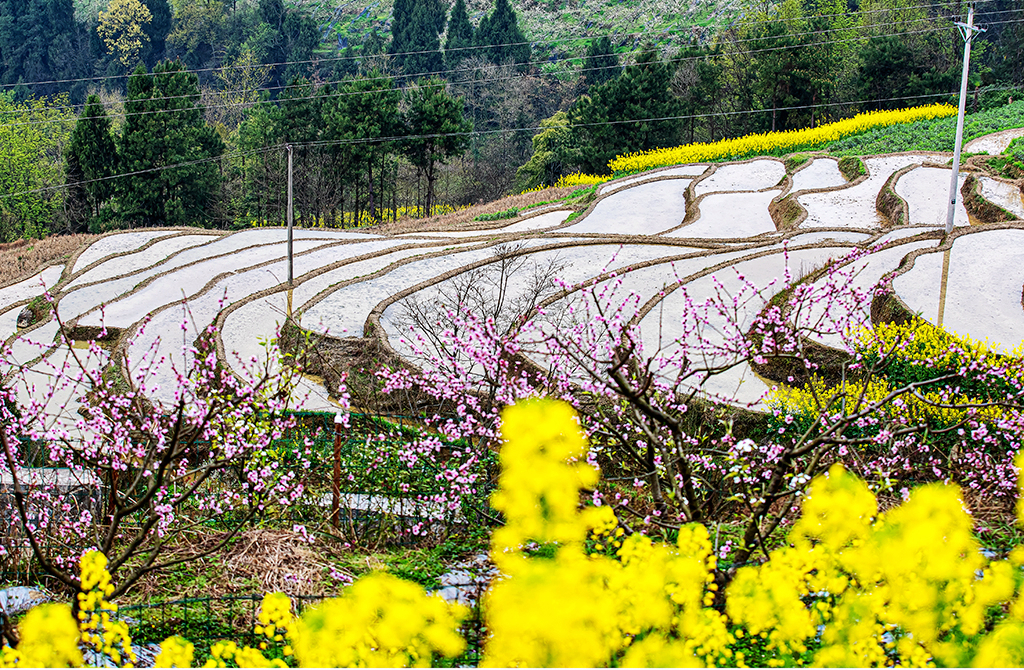 3月12日,从鲜花盛开的大岭山上俯瞰四周,那一层层梯田线条行云流水,潇洒柔畅,宛若盘旋在山坡上的时光天梯,呈现出一幅天然的山水画卷。