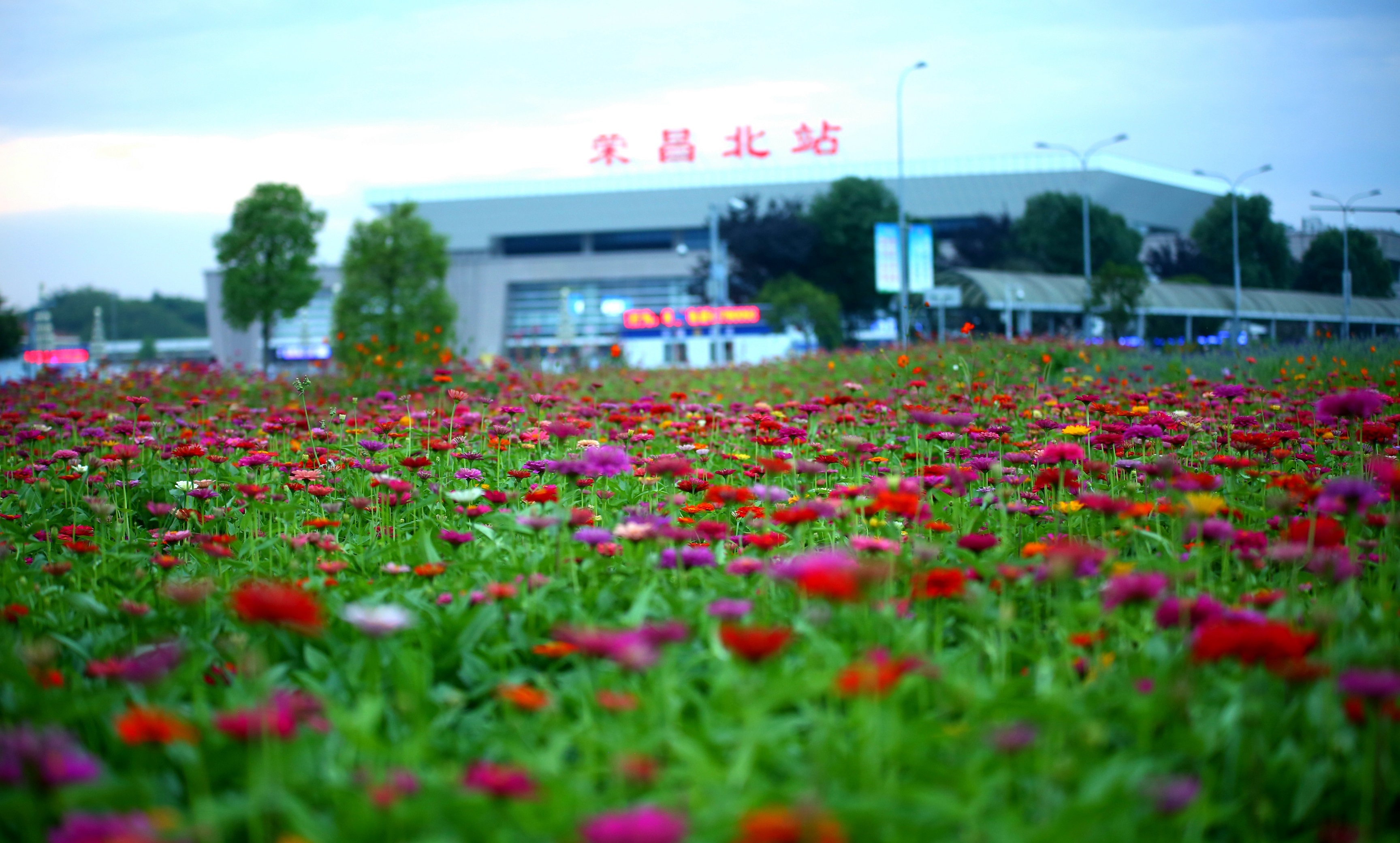 今年三月,重庆市荣昌区实施绿化美化提升工程,在城区闲置空地播撒了百日菊、黄秋英、彩苞鼠尾草、格桑花等鲜花种子,成渝高铁荣昌北站站前广场两旁的空地就是其中之一。