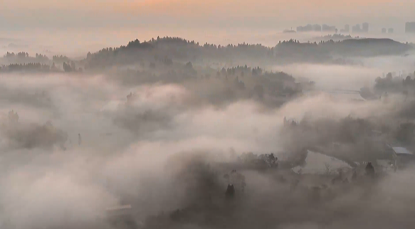近日,大足区万古镇晨雾缭绕,城市高楼掩映在大雾之中,时隐时现,好似海市蜃楼,在晨曦的映照下,雾气呈现出淡淡的金黄色,宛若一幅“水墨丹青”画卷。