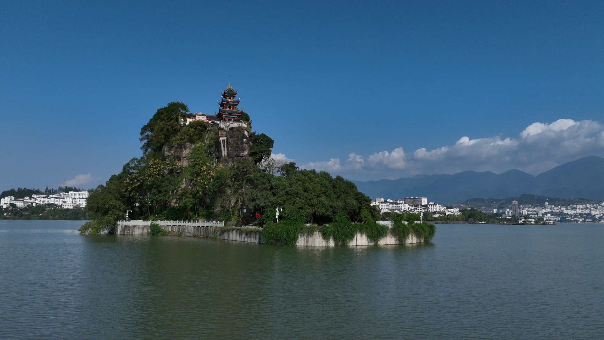 三峡水库经过1个多月的蓄水,长江江面变宽,水流变缓,变身为烟波浩渺的“平湖”。10月15日,长江忠县段水位达到175米,忠县石宝寨被万顷碧水包围,从空中俯瞰,石宝寨草木葱茏,宛如江中“小蓬莱”,美不胜收。