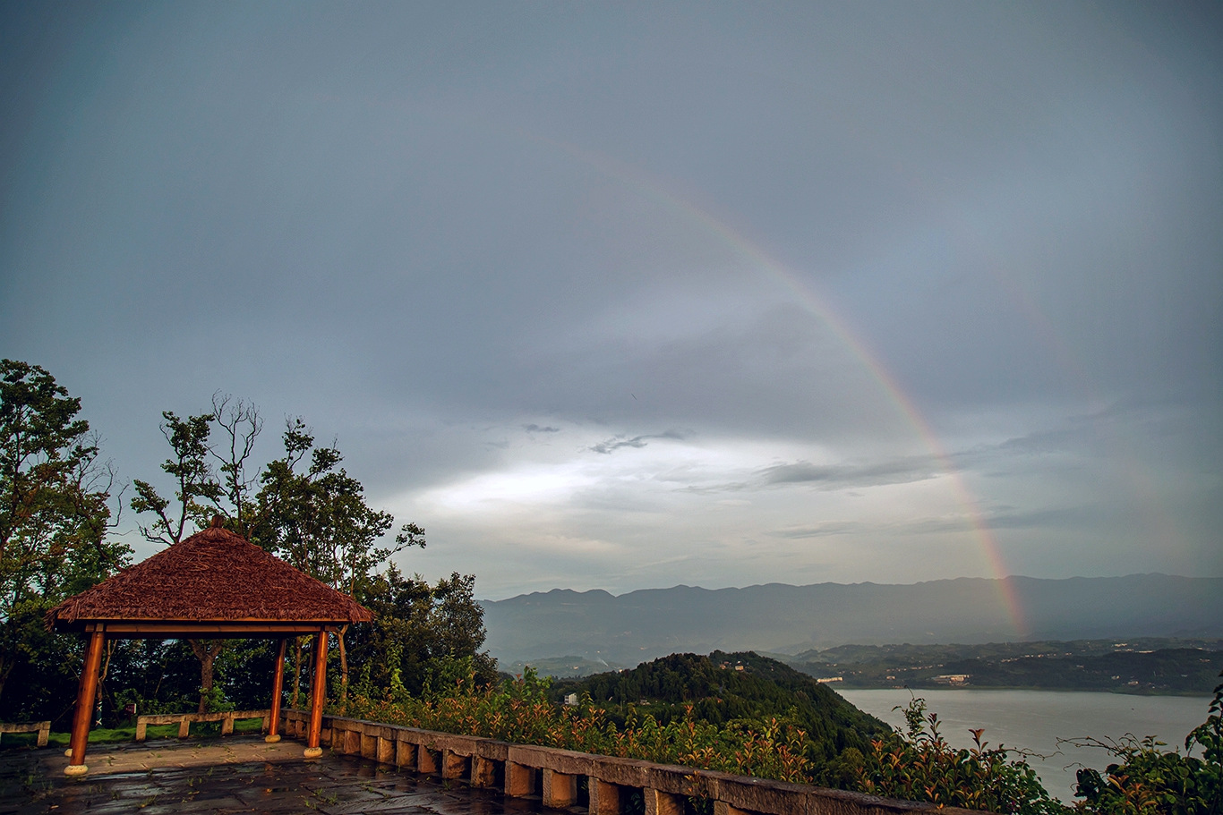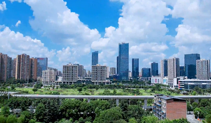 夏日雨后,铜梁城区上空云朵飘飘,云上天空湛蓝、远山如黛,云下草木青翠、湖水清澈,龙乡美如画卷。