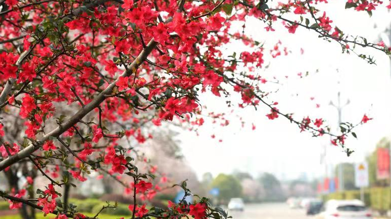 春节临近,重庆荣昌城区贴梗海棠热情绽放,红红火火迎新春。