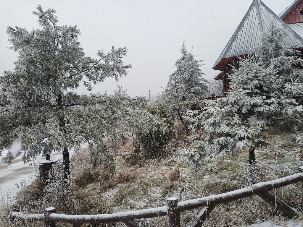 受降雨降温天气影响,11月21日,重庆市城口县黄安坝景区迎来降雪天气。