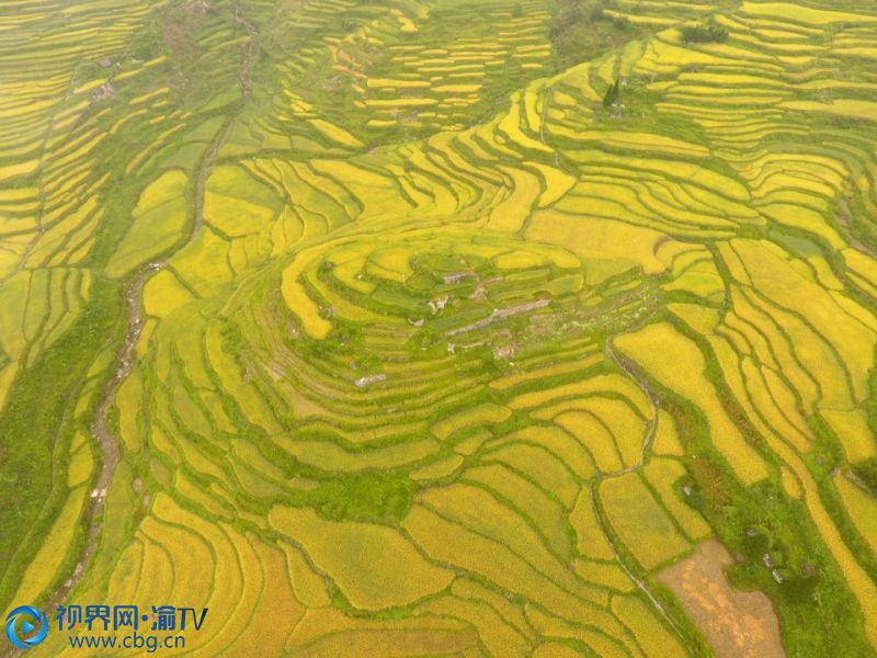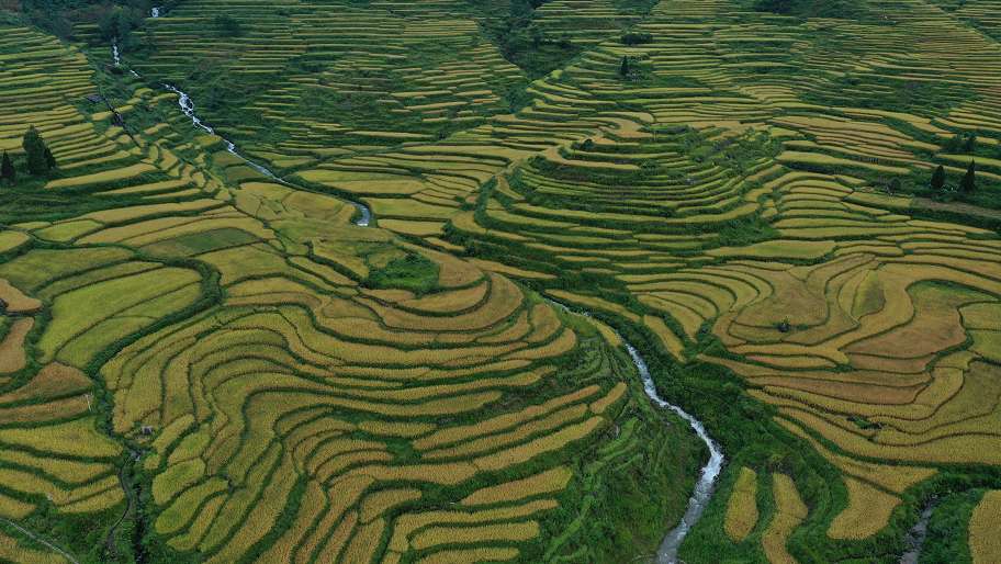 金秋时节,稻谷飘香,酉阳县花田乡何家岩村,万亩梯田迎来丰收季。