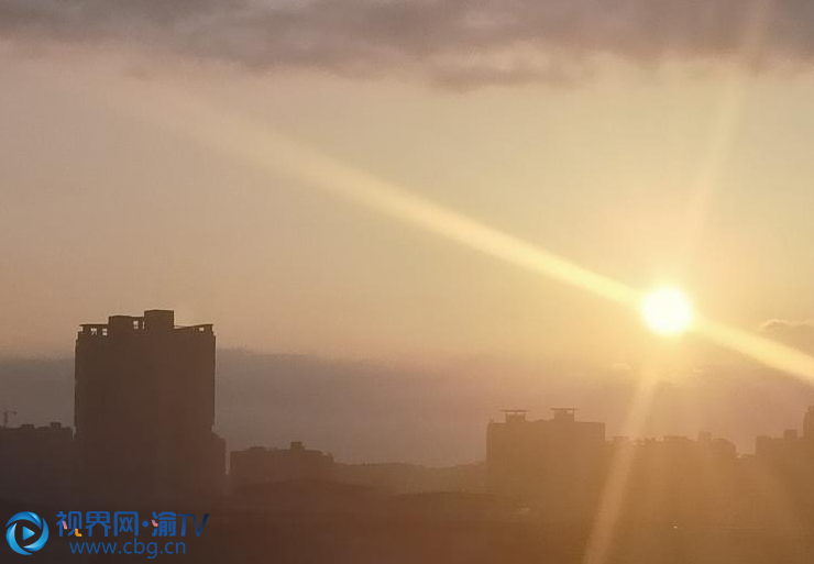 8月31日傍晚7时许,天空形成两层不同色调的乌云,而中间的是刚出现的晚霞,时不时太阳弹出个头了,把乌云周围的景观和大地普照出来,呈现出别样的“夹心太阳”奇观,煞是靓丽。