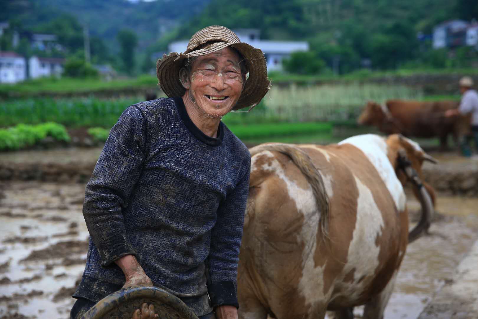 初夏时节,重庆巫溪菱角镇,当地农民利用晴好天气抓紧劳作,稻田里一片忙碌景象。图为喜笑颜开的菱角镇菱角村的村民。