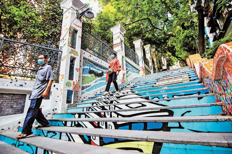 步道阶梯由亮色瓷砖装点,阶梯的立面上涂绘了渝中区的热门景点,步道旁修建了“文化墙”。美丽的步道增添了山城的颜值,提高了市民的生活品质。