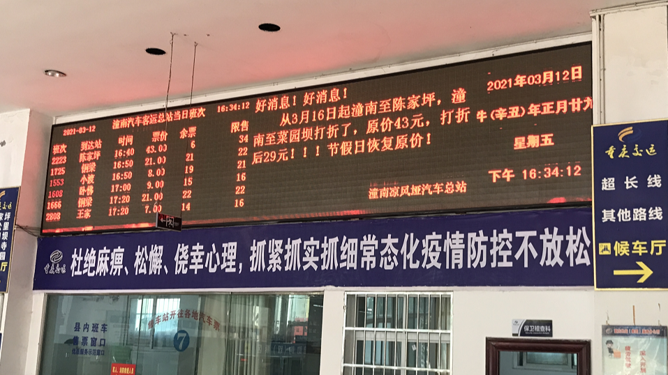 3月12日,记者从重庆长运集团潼南分公司获悉,为回馈广大市民,助力企业和农民工复产复工、方便和服务市民出行,3月16日起,潼南至重庆大巴车票价打折,低至22元。