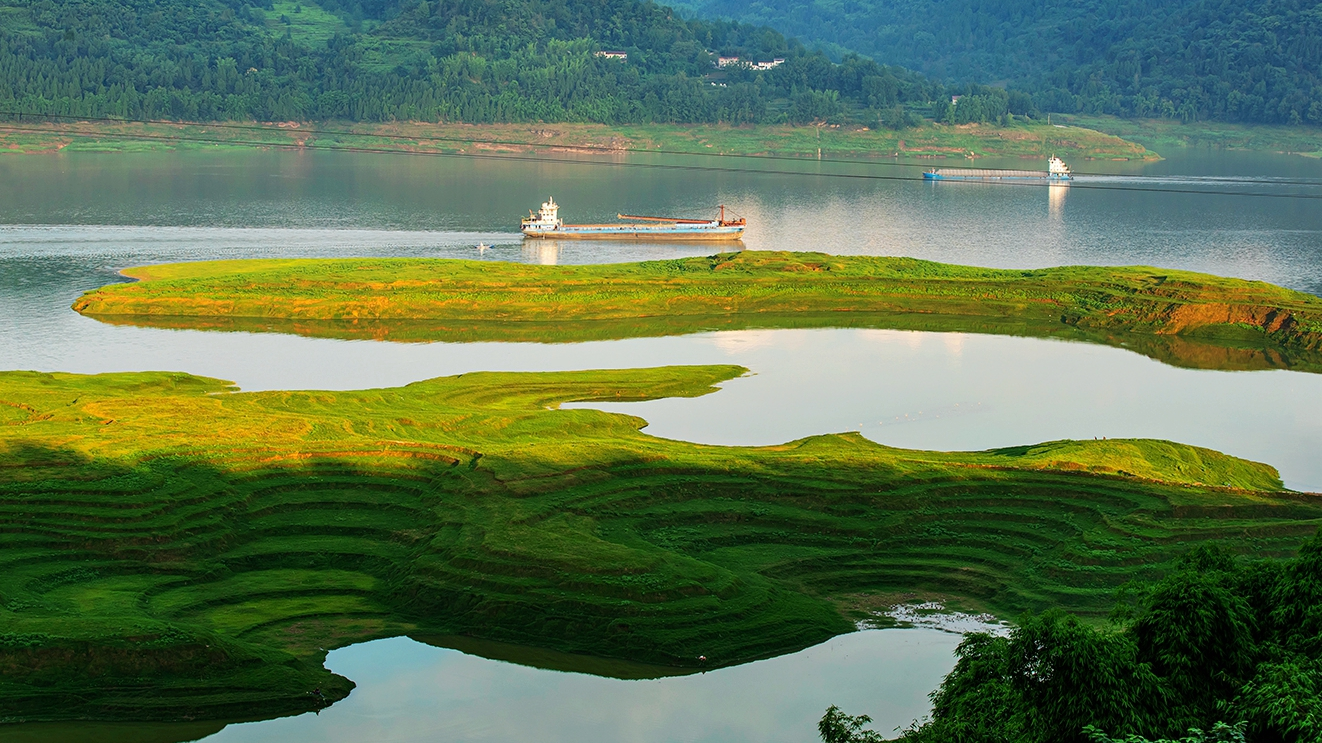 6月25日,从忠县涂井乡友谊村上空俯瞰下去,一块块湿地宛若一片片绿洲,景致秀美,分外迷人。
