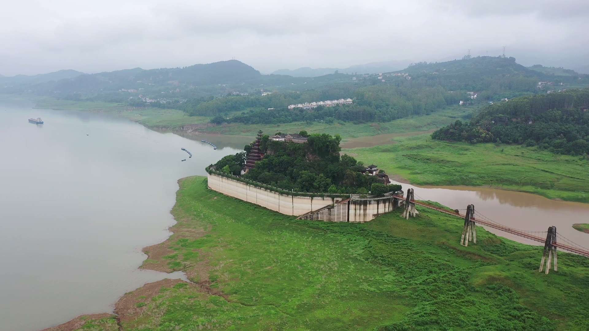6月23日,长江忠县段水位已降至152.37米,位于长江北岸的江上明珠石宝寨整体露出江面,放眼望去,景区及周围草长莺飞,美不胜收。