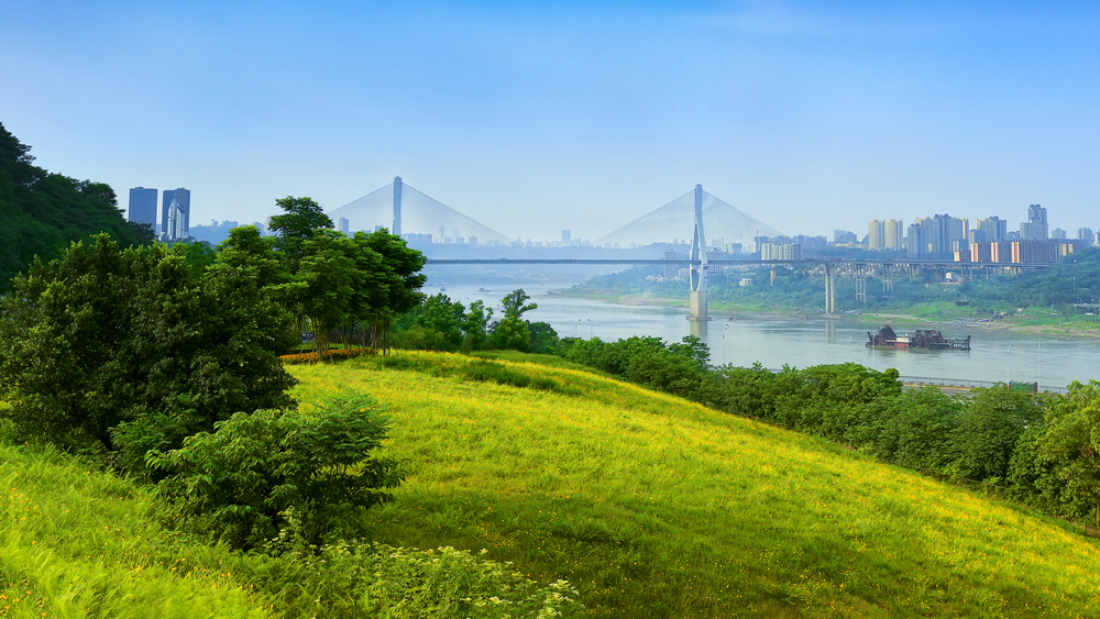 长江边上,重庆马桑溪长江大桥下,遍地绿草黄花。