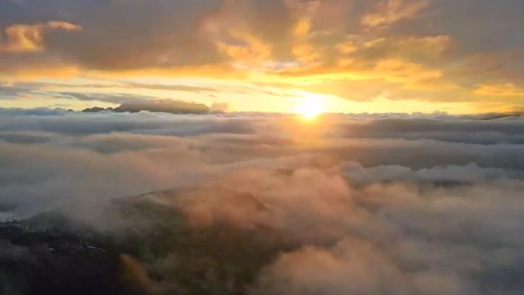 阳春四月,太阳穿过云海喷薄而出,给整片山间镀上一层夺目的金色,风云变幻令人目不暇接。