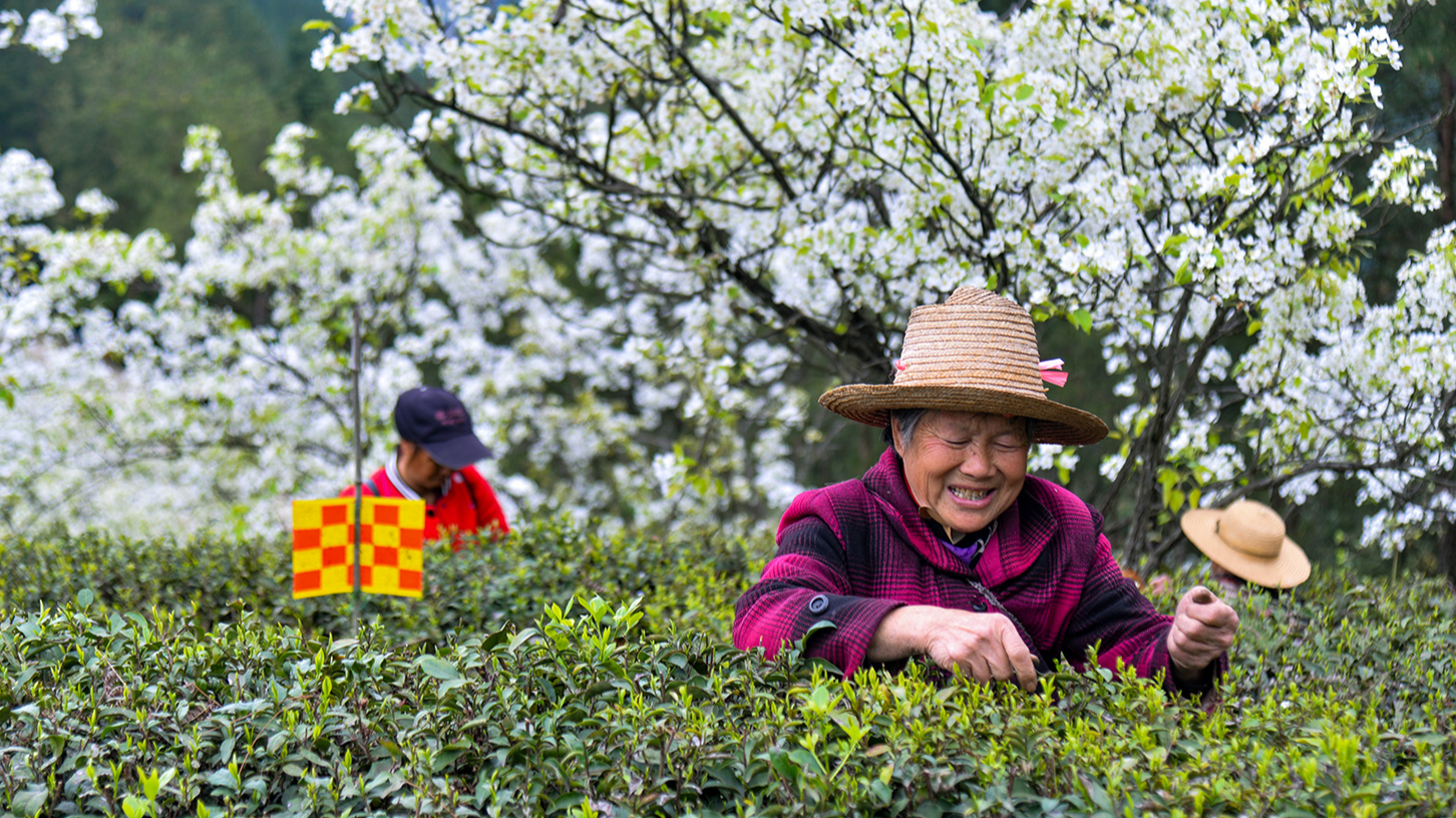 重庆市万州区长岭镇青石社区,1000多亩茶园嫩芽勃发,村民正忙着采摘春茶。