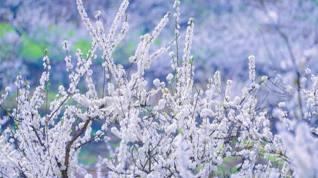 荣昌区清升镇罗汉寺村200余亩连片李花开得正艳,远远望去像一条洁白的丝带,花枝随风而动,宛如素衣舞者,衣袂飘飘,潇洒飘逸。