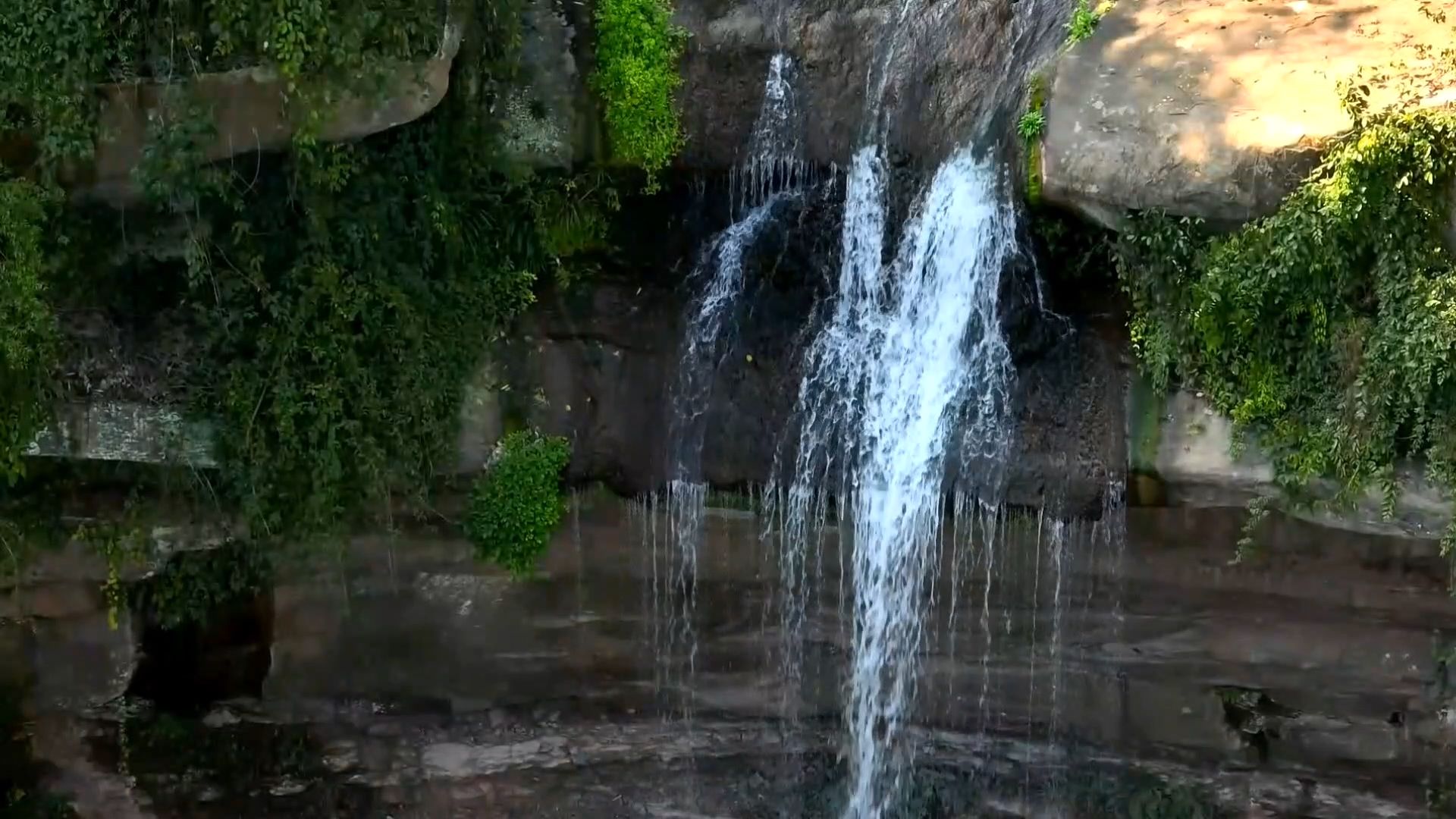 一条白练沿着宽阔峭壁飞泻而下,在岩石上和深潭里溅起千朵银花。透过斑驳的阳光,水流明丽如链,水花晶莹多芒。
