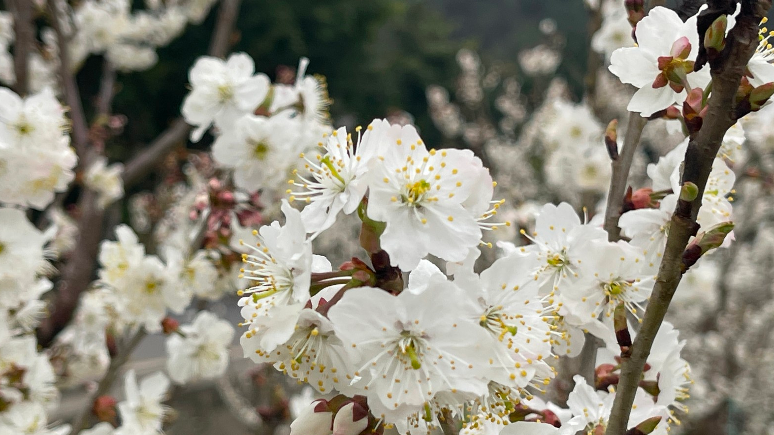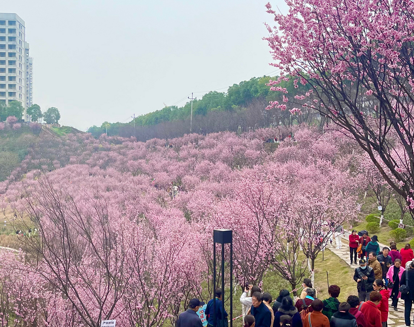 阳春三月,草长莺飞,渝北区跳墩河公园百塘园里,上千株美人梅悄然绽放,满山遍野的梅花连成一片花海,散发出春天的气息。