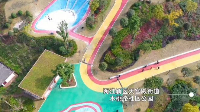 在两江新区天宫殿街道木桃路社区公园,大人带着孩子在儿童沙池里挖沙、堆城堡。还有的小朋友沿着滑梯飞速而下,肆意享受美好童年时光。