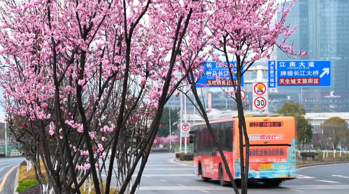 随着近日天气转暖,万州滨江环湖的红梅、早樱、海棠等花卉竞相绽放,一辆辆环湖公交车行驶在花海之间,被当地市民称为“开往春天的巴士”。