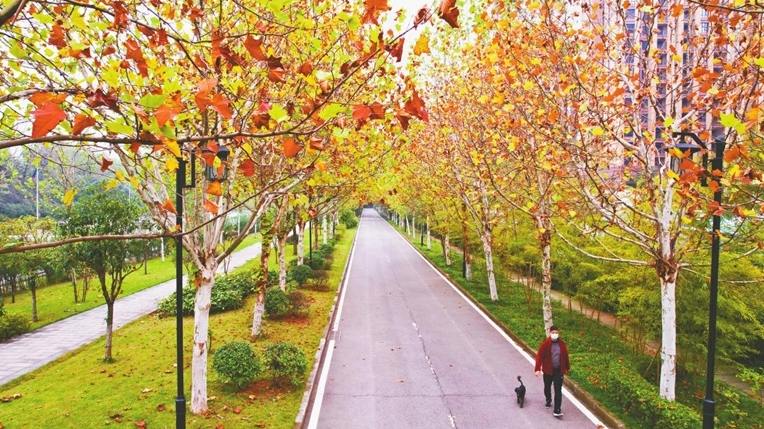 在重庆市大渡口区义渡公园内,一条近500米的道路两旁,上百棵法国梧桐已进入变色落叶期。笔直的法国梧桐挺立在道路两侧,树皮斑驳、叶色斑斓,树枝上、草坪中,泛黄的树叶将道路装扮成一条“金色大道”,浪漫爆表,给冬日的城市带来一抹靓色。