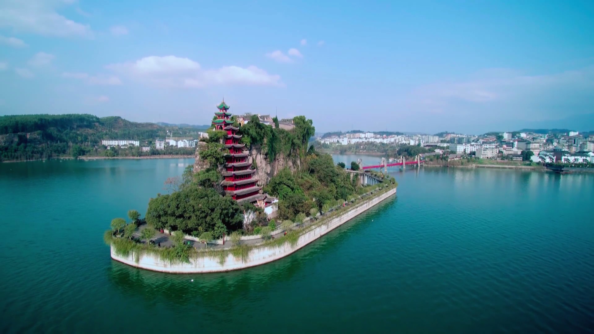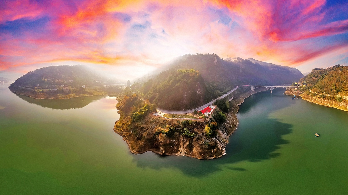 湖水悠悠、层林尽染……12月21日,从空中往下俯瞰,重庆忠县㽏井沟景色秀美,宛若一幅色彩斑斓的山水画卷。