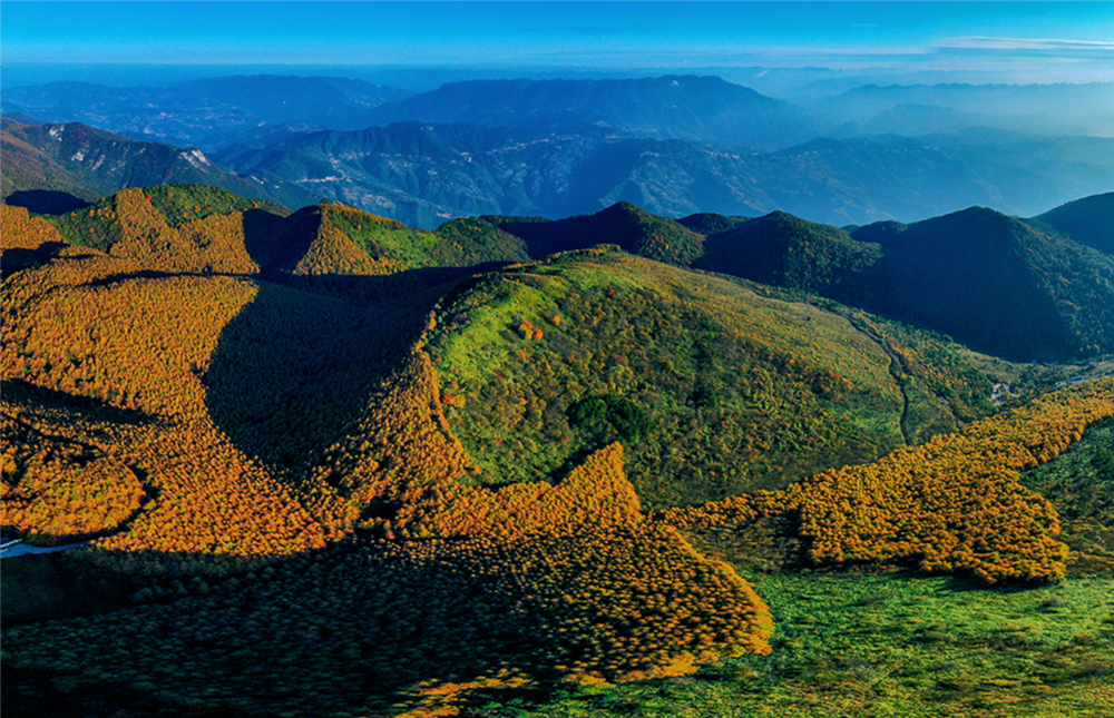 时至初冬,重庆市巫山县梨子坪森林公园内,云淡、天蓝,满目皆是美得醉人的秋景。