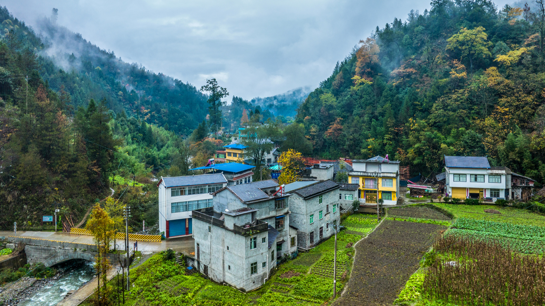 初冬清晨,在薄雾笼罩下,村庄与河流、田地、远山相互映衬,构成了一幅美丽的乡村画卷。