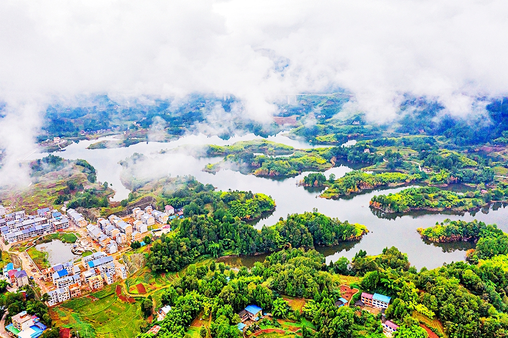 从空中俯瞰忠县金鸡水库,数十个形态各异的山峦“浮出”水面,宛若袖珍版的“千岛湖”映入眼帘。每当雨后天晴时,这里云雾升腾、湖光山色,呈现出仙境般的景致。