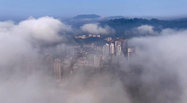 这段时间早晚温差大,重庆万盛城区出现大范围的云海景观。清晨的万盛,洁白的云雾形成广阔的云海漂浮于城区上空,随风漂移、翻转腾挪。