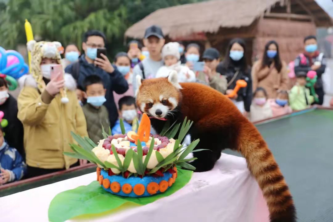 11月27日,重庆永川乐和乐都主题公园为小熊猫举办4岁生日会,数十组亲子家庭一起为小熊猫弯弯庆生。