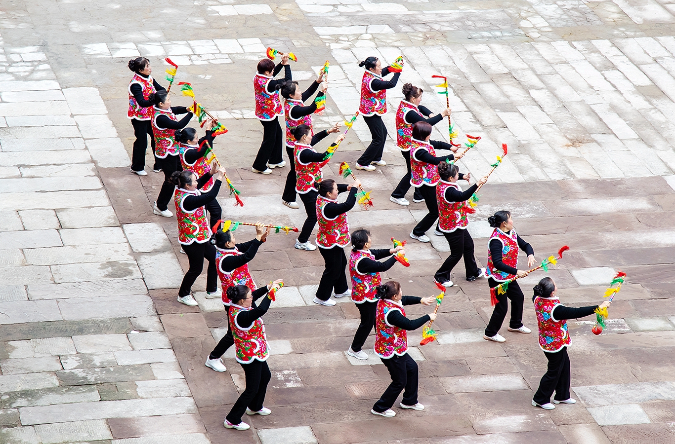 1月29日,忠县忠州街道30多位大妈齐聚三峡留城·忠州巷子“打钱棍”,营造出喜迎新春的浓厚氛围。