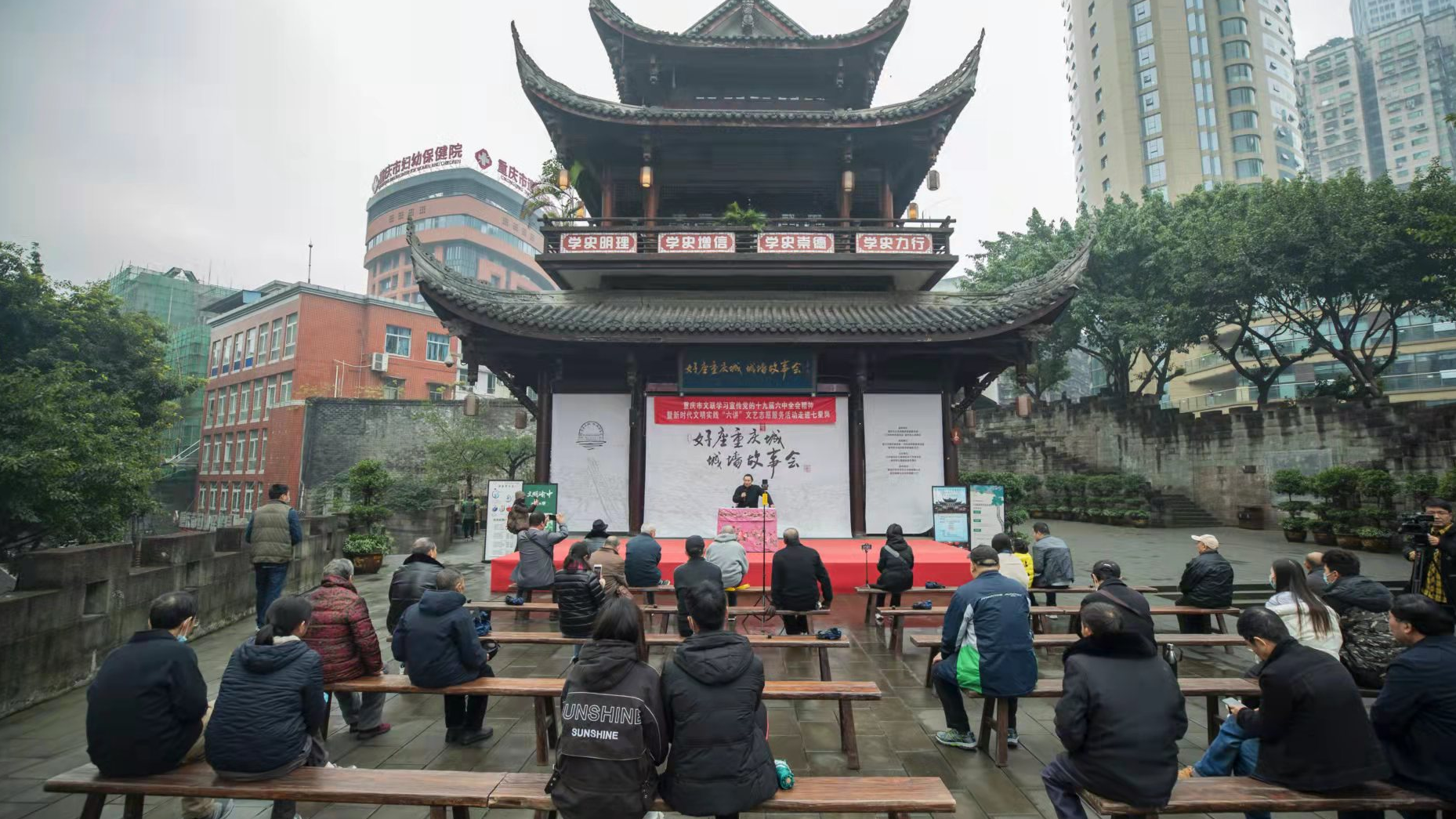 “城墙故事会讲的是巴渝文化,说的是母城故事,很有意思。我几乎场场都来听,都已经成了一种习惯了。”11月27日午后,细雨纷纷,“好座重庆城·城墙故事会”主题文艺活动迎来它“一周岁”的生日。一众“故事迷”如约来到通远门城墙遗址公园,听故事精彩开讲。
