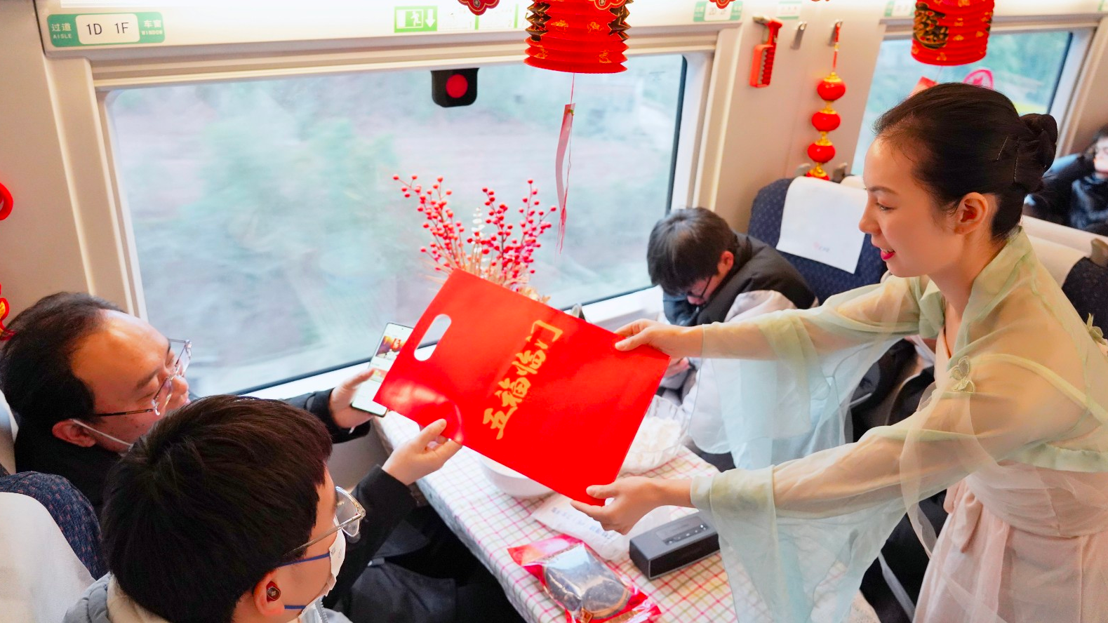 元宵节来临,重庆客运段在部分高铁上开展“高铁送福闹元宵”活动,乘务员与旅客一道猜灯谜做灯笼,体验传统民俗闹元宵的乐趣。