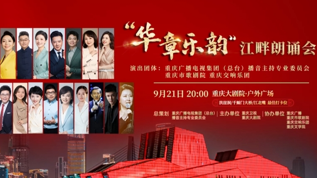 天地为幕,山水为台;江河远阔,灯火盈天。重庆广电集团播音主持专委会联袂重庆歌剧院重庆交响乐团,以深情的朗诵和激昂的乐章,共同唱响对祖国深沉的爱。9月21日20时,“华章乐韵”江畔朗诵会与您相约重庆大剧院。