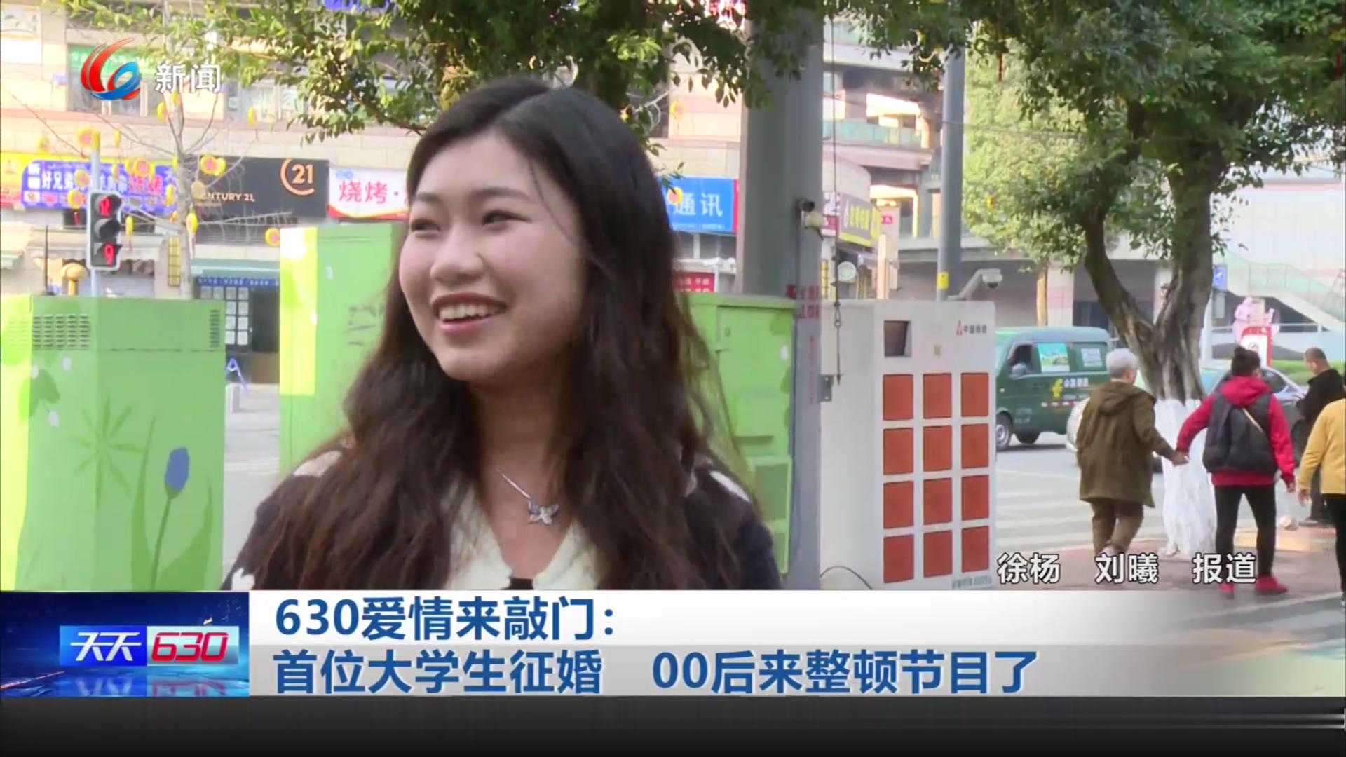 天天630,爱情来敲门。记者当红娘,先生女士都漂亮。2月20日的征婚嘉宾是一位20岁的女大学生,尹熙熙。小尹在广西玉林读大学,正放寒假在家。她想找一个重庆男朋友,培养培养感情,大学毕业后,还回重庆来工作生活。大学生活,学业和感情,她两手都要抓。