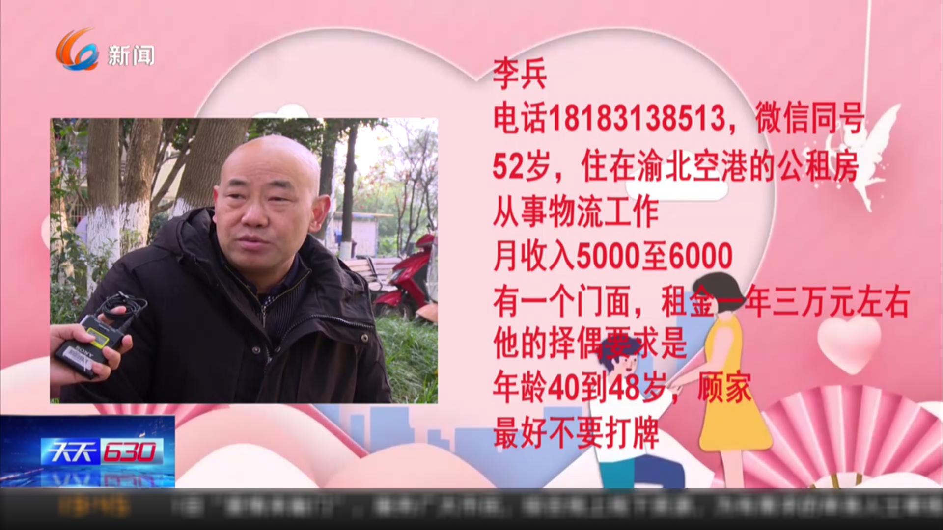 天天630,爱情来敲门。记者当红娘,先生女士都漂亮。1月6日的征婚嘉宾,是630爱情来敲门的忠实观众、 52岁的李兵,他关注我们节目很久了,这次鼓起勇气报了名,想来寻找一下自己的缘分。