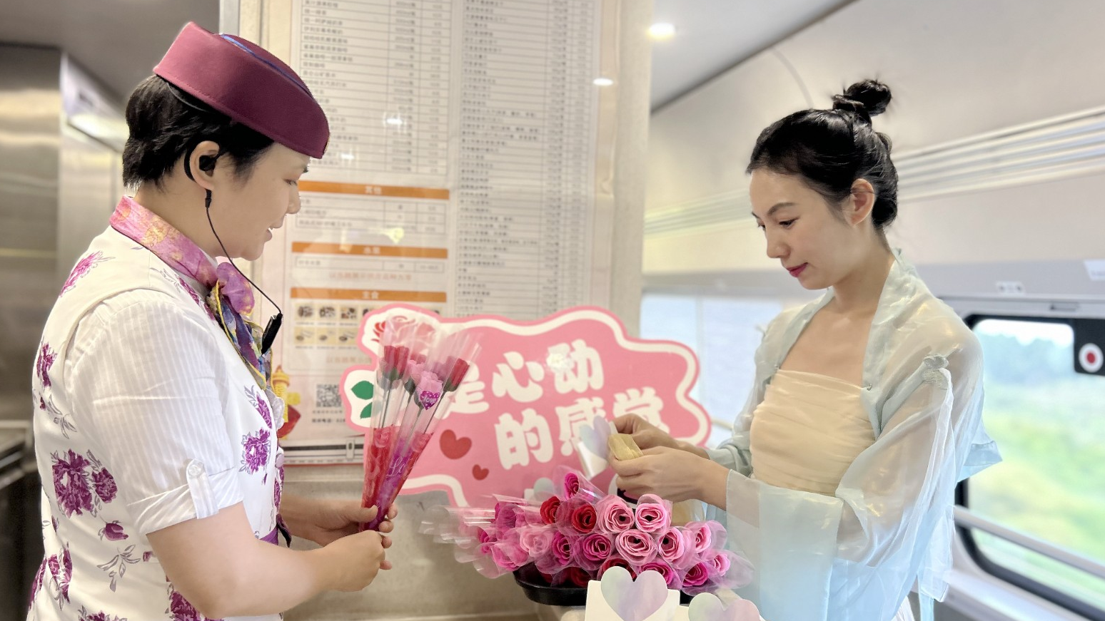 8月10日是中国传统的“七夕节”。节日到来之际,重庆客运段在部分高铁动车上开展了丰富多彩的“浪漫七夕·与你相遇 爱要大声说出来”主题活动,让旅客们在旅途中过了一个浪漫温馨而又特别有意义的“七夕节”。