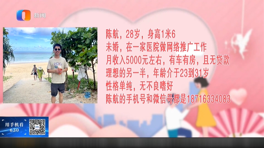天天630,爱情来敲门;记者当红娘,先生女士都漂亮。一起走进今天(11月17日)的“630爱情来敲门”。今天登场的男嘉宾,是家住渝北回兴的95后小伙儿陈航。28岁的小陈,是一名“母胎单身”,至今没谈过恋爱。不过,恋爱经历一片空白的小陈,却有着独特的婚恋观。一起来认识一下他。