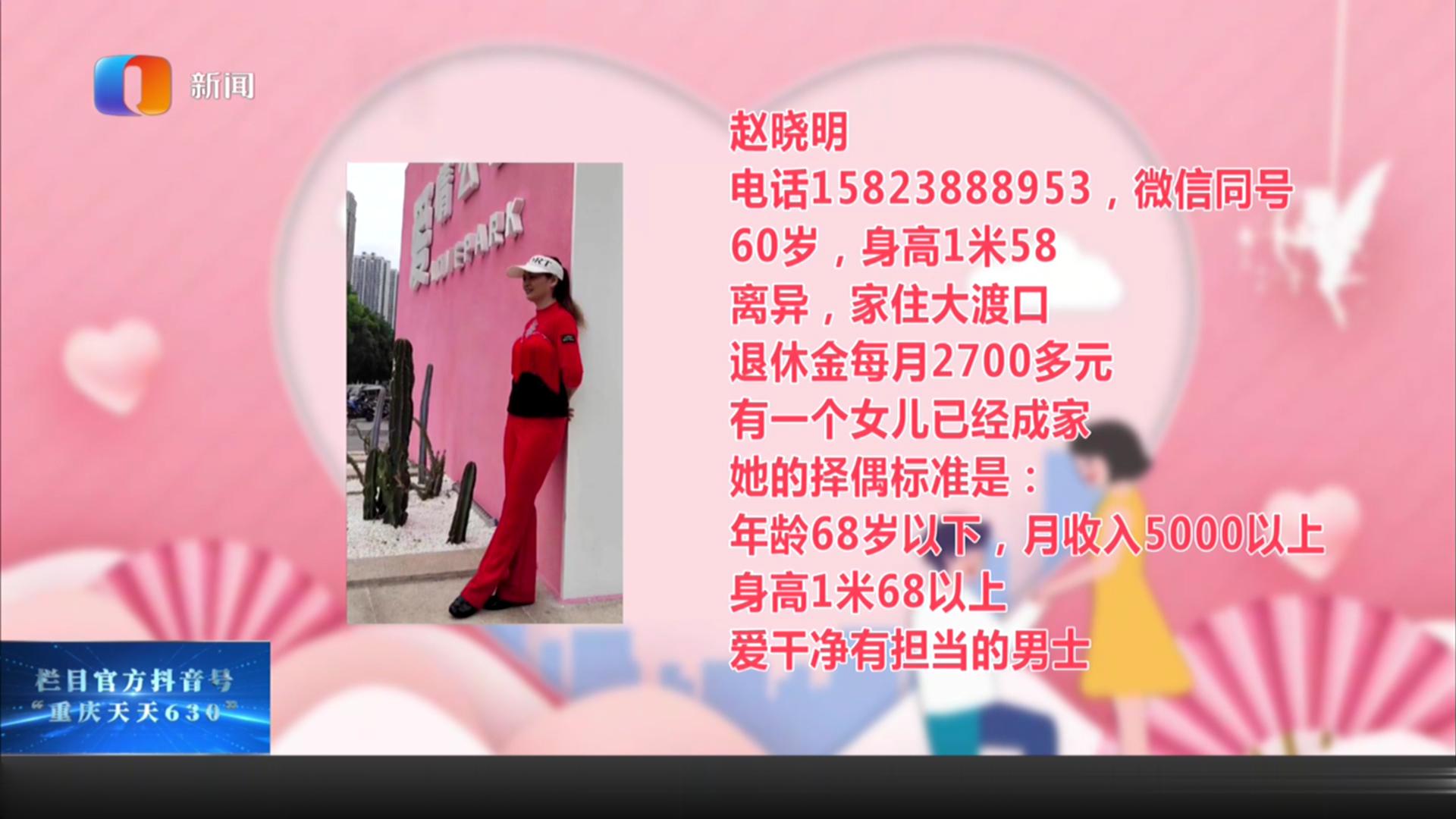 新闻服务市民,630甘当月老,一起来看婚恋交友版块“630爱情来敲门”。今天的征婚嘉宾,是60岁的付春梅女士。付女士是四川广安人,在贵阳定居,她很早就关注到我们的节目,心向往之,这次专程从贵阳赶来重庆征婚。