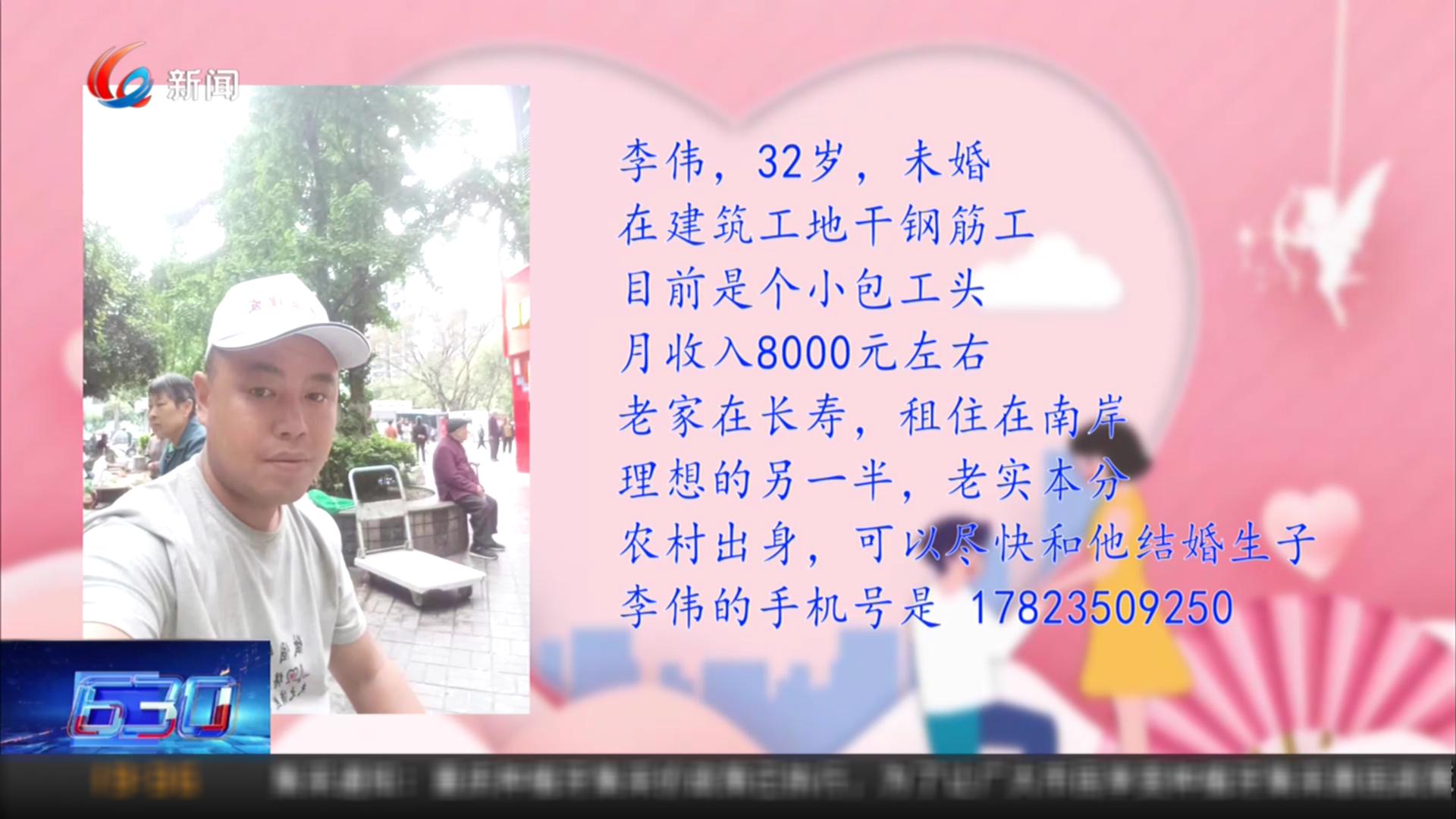 天天630,爱情来敲门;记者当红娘,先生女士都漂亮。5月23日的征婚嘉宾,是32岁的张亮,他之前是一名厨师,现在转行做电焊工,目前在长寿工作。来认识一下他。